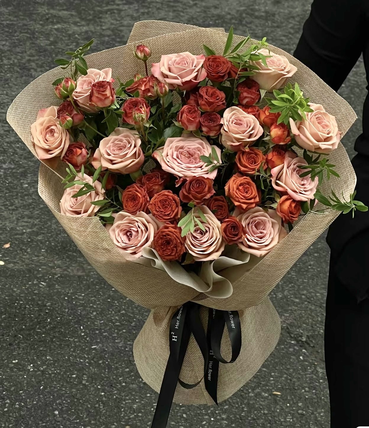 Hoa gồm có: hoa hồng capu , hồng chùm socola, lá phụ khác...