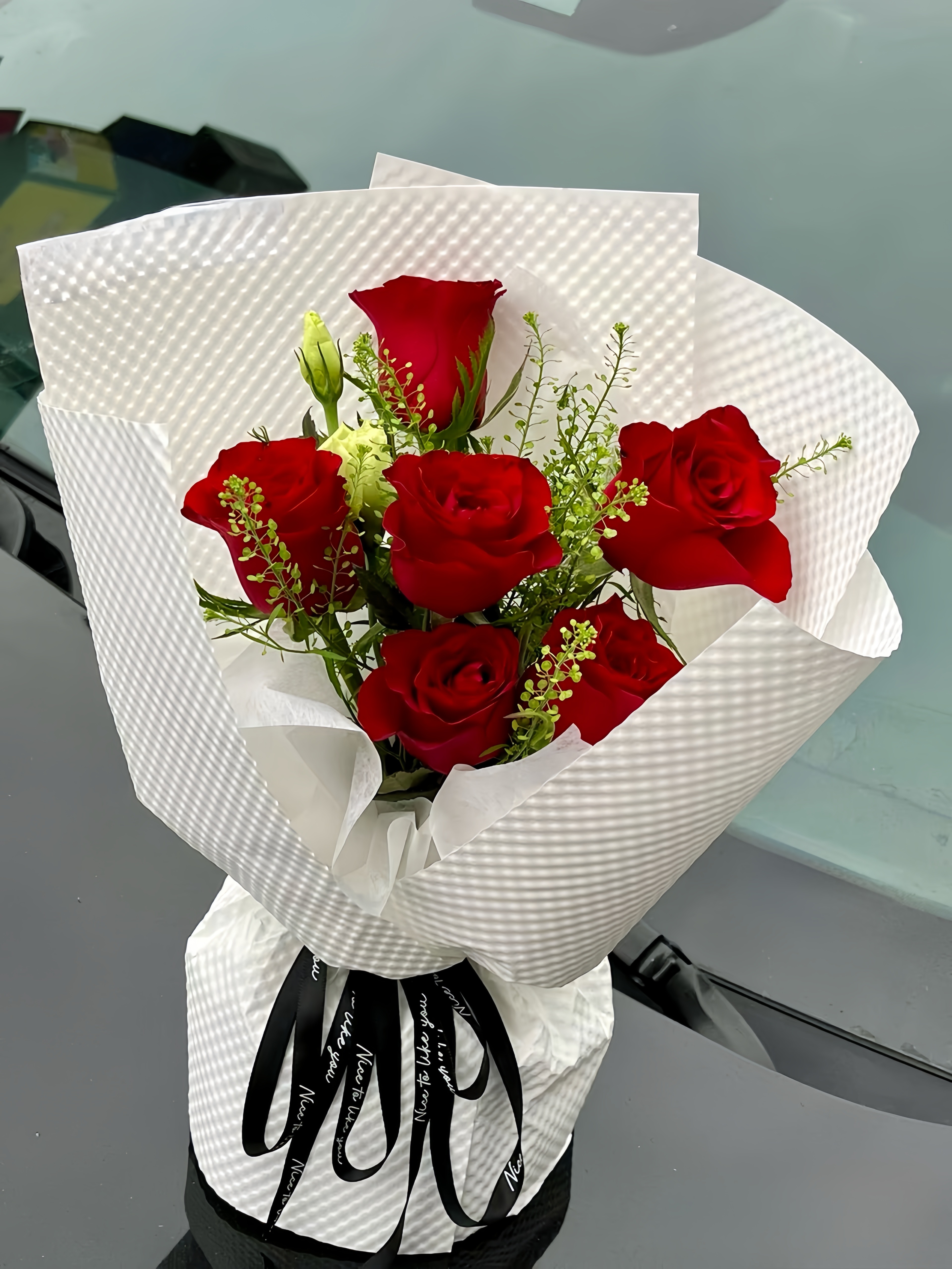 Hoa gồm có: 6 hoa hồng đỏ ecuador ĐL mix cùng cỏ đồng tiền