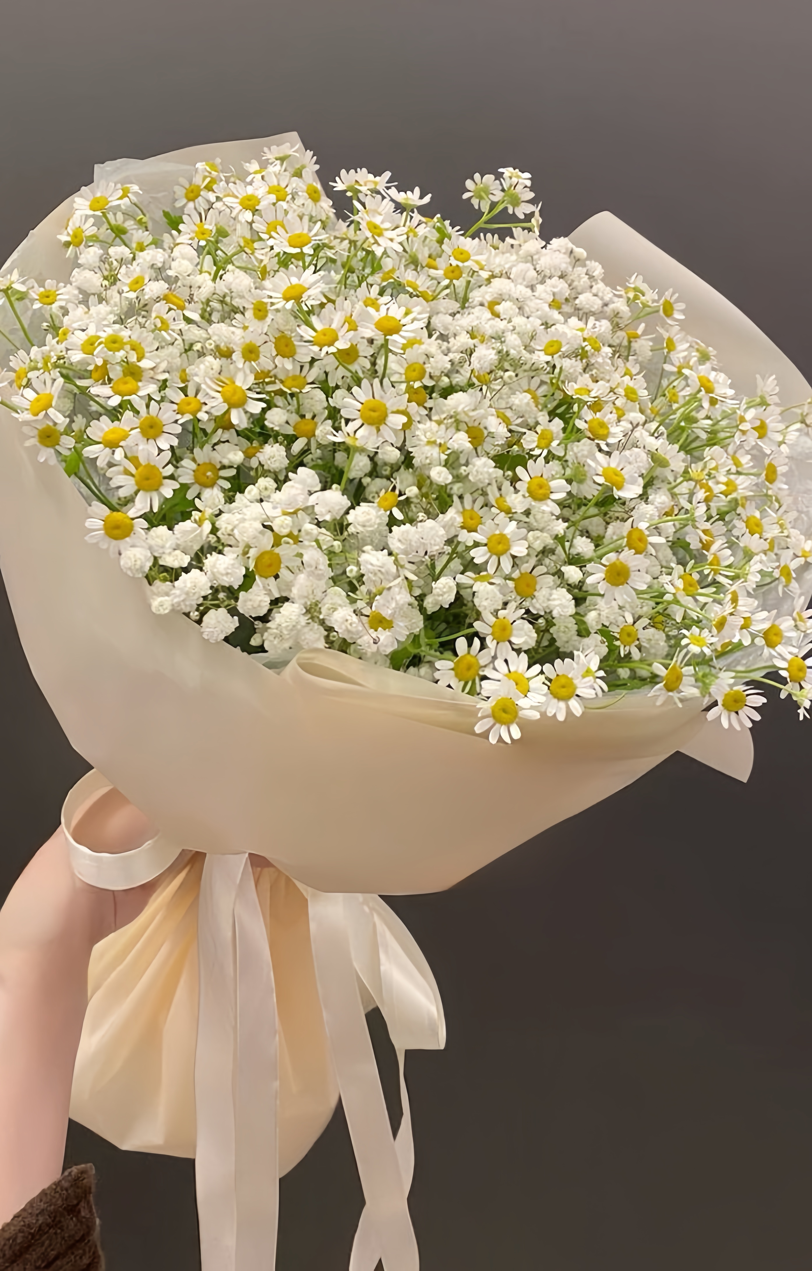 Bó hoa kết hợp giữa cúc tana và baby trắng là sự giao thoa hoàn hảo giữa nét tự nhiên mộc mạc và sự thanh thoát dịu dàng. Cúc tana nhỏ xinh như nụ cười duyên dáng, còn baby trắng lại nhẹ nhàng như làn mây, mang đến tổng thể hài hòa, thanh thoát mà vẫn đầy cảm xúc.