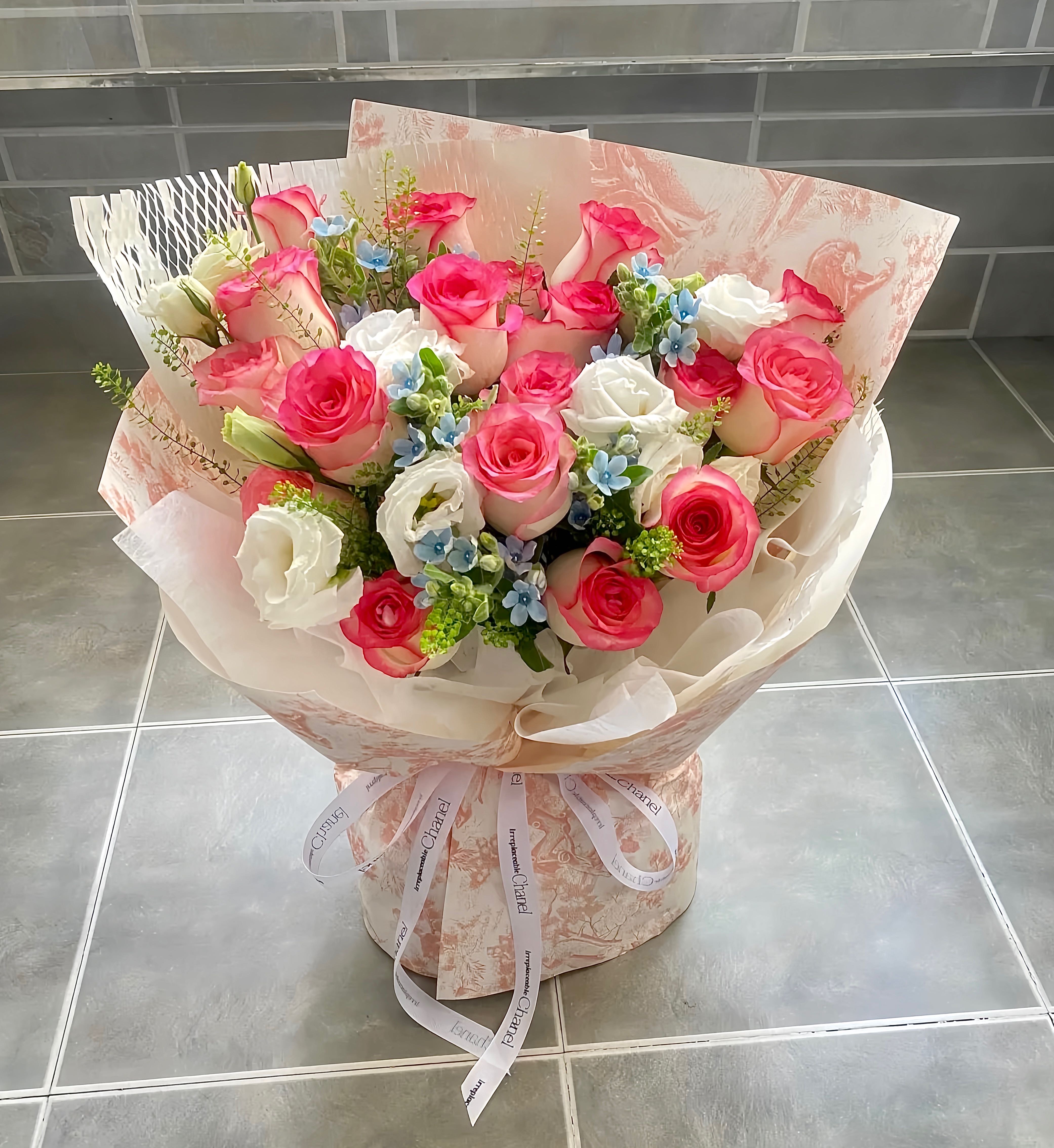 Bó hoa tươi tone hồng thắm với những cánh hoa mềm mại, e ấp tựa như những lời thì thầm yêu thương. Mỗi bông hoa mang một vẻ đẹp thanh thoát, tươi mới, như một làn sóng nhẹ nhàng, mang đến sự yêu thương tinh khiết và ngưỡng mộ chân thành. Với mỗi cánh hoa mềm mại, bó hoa trở thành thông điệp yêu thương nhẹ nhàng, ấm áp, như một cái ôm thật nhẹ vào trái tim người nhận.