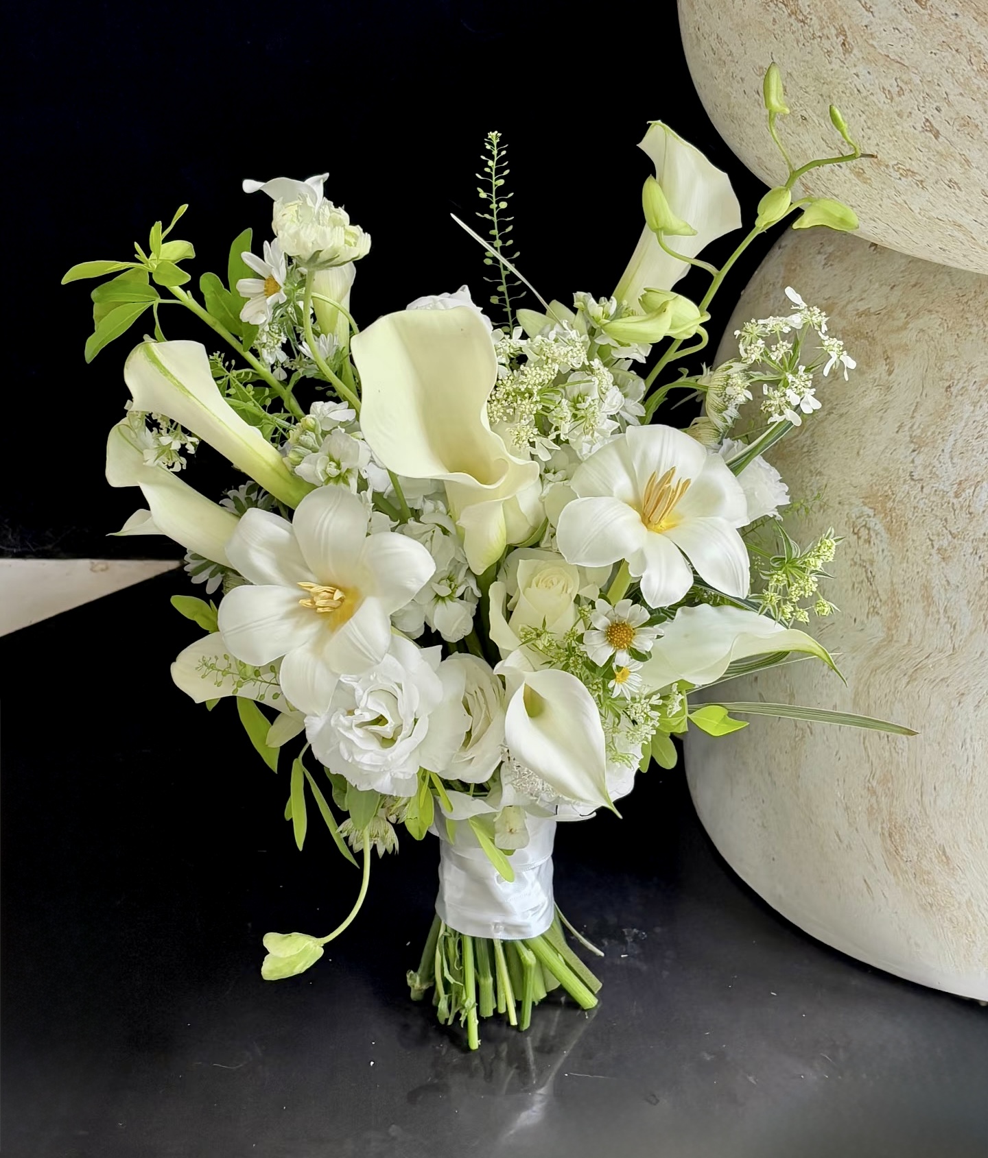 Sản phẩm bao gồm: 2 hoa tulip nhập khẩu, 8 calla lily nhập khẩu, hoa cát tường trắng, hoa zen, cúc họa mi nhật, hoa phi yến....