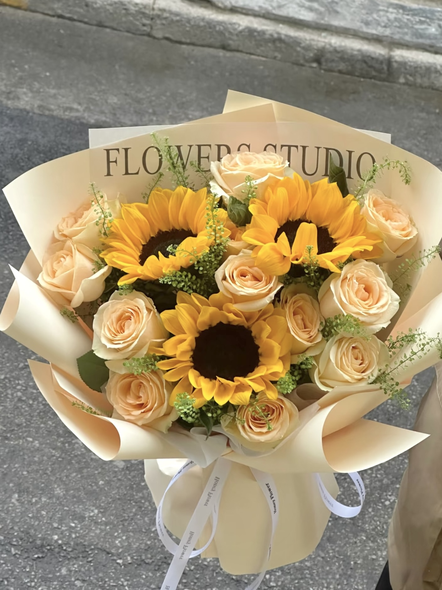 Bó hoa hướng dương như mặt trời nhỏ, mang đến niềm vui, năng lượng tích cực và hy vọng cho người nhận. Từng bông hoa vươn mình rực rỡ như lời nhắn “hãy luôn lạc quan, mạnh mẽ và tỏa sáng”. Món quà này không chỉ ngọt ngào, lãng mạn mà còn gửi gắm thông điệp yêu thương, cổ vũ tinh thần.
