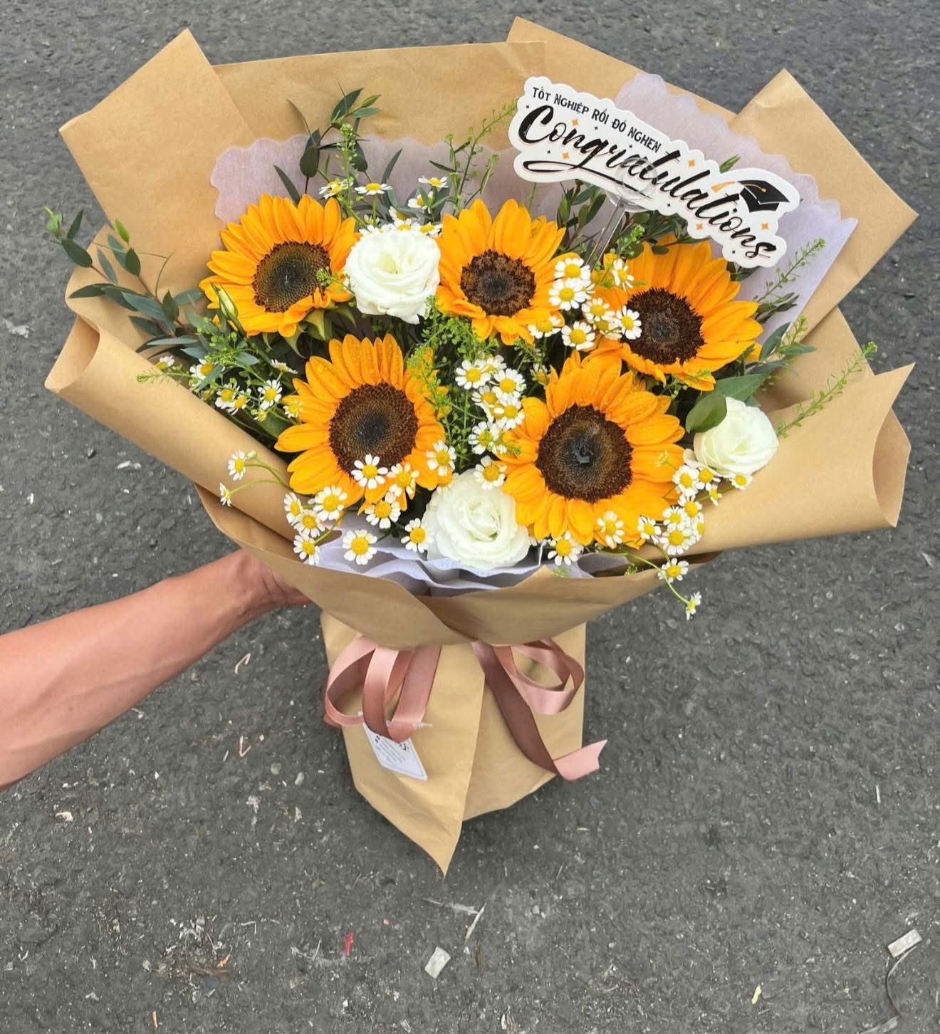 Bó hoa hướng dương như mặt trời nhỏ, mang đến niềm vui, năng lượng tích cực và hy vọng cho người nhận. Từng bông hoa vươn mình rực rỡ như lời nhắn “hãy luôn lạc quan, mạnh mẽ và tỏa sáng”. Món quà này không chỉ ngọt ngào, lãng mạn mà còn gửi gắm thông điệp yêu thương, cổ vũ tinh thần.