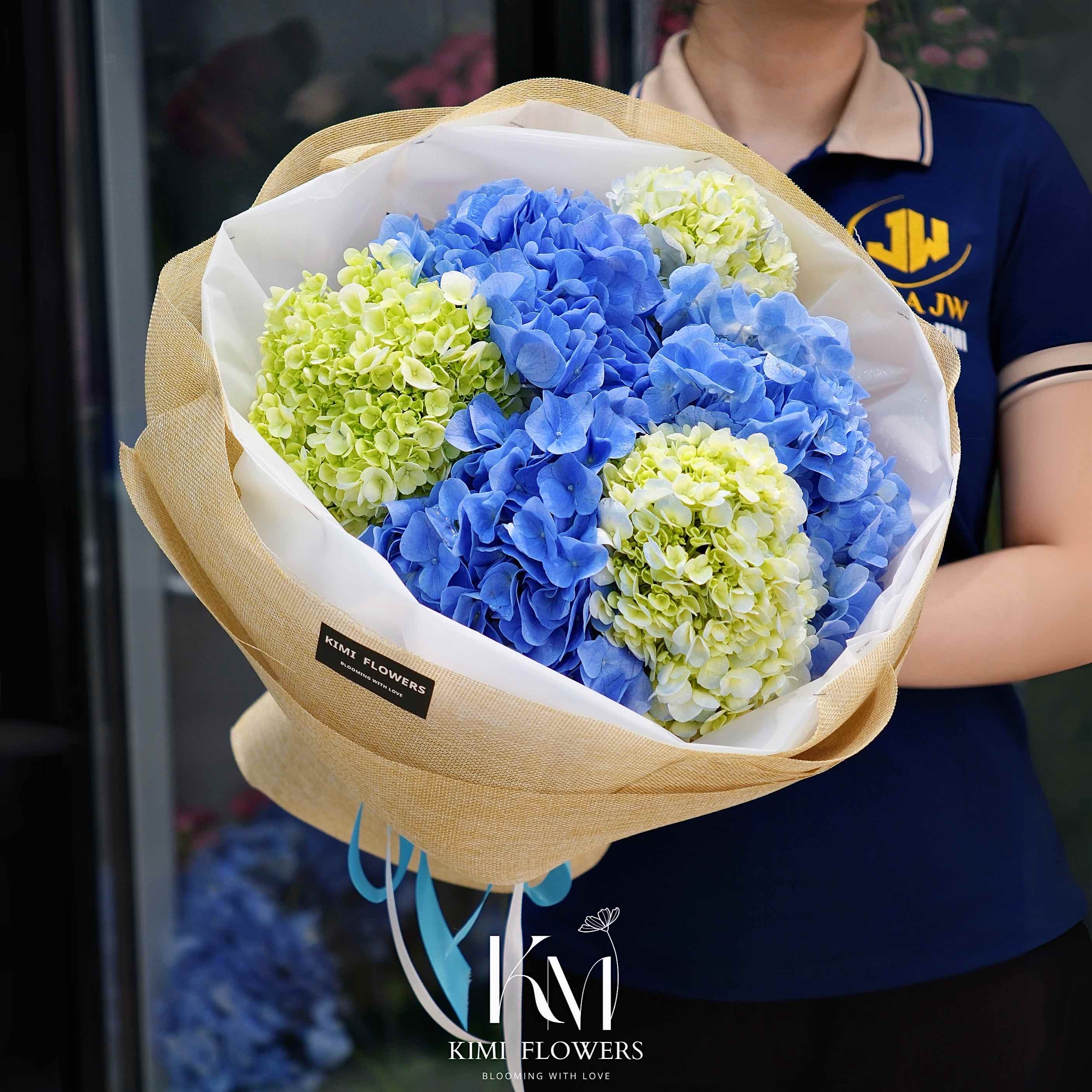 Hoa gồm có : cẩm tú cầu xanh dương nhập khẩu mix cùng xanh bơ đà lạt.