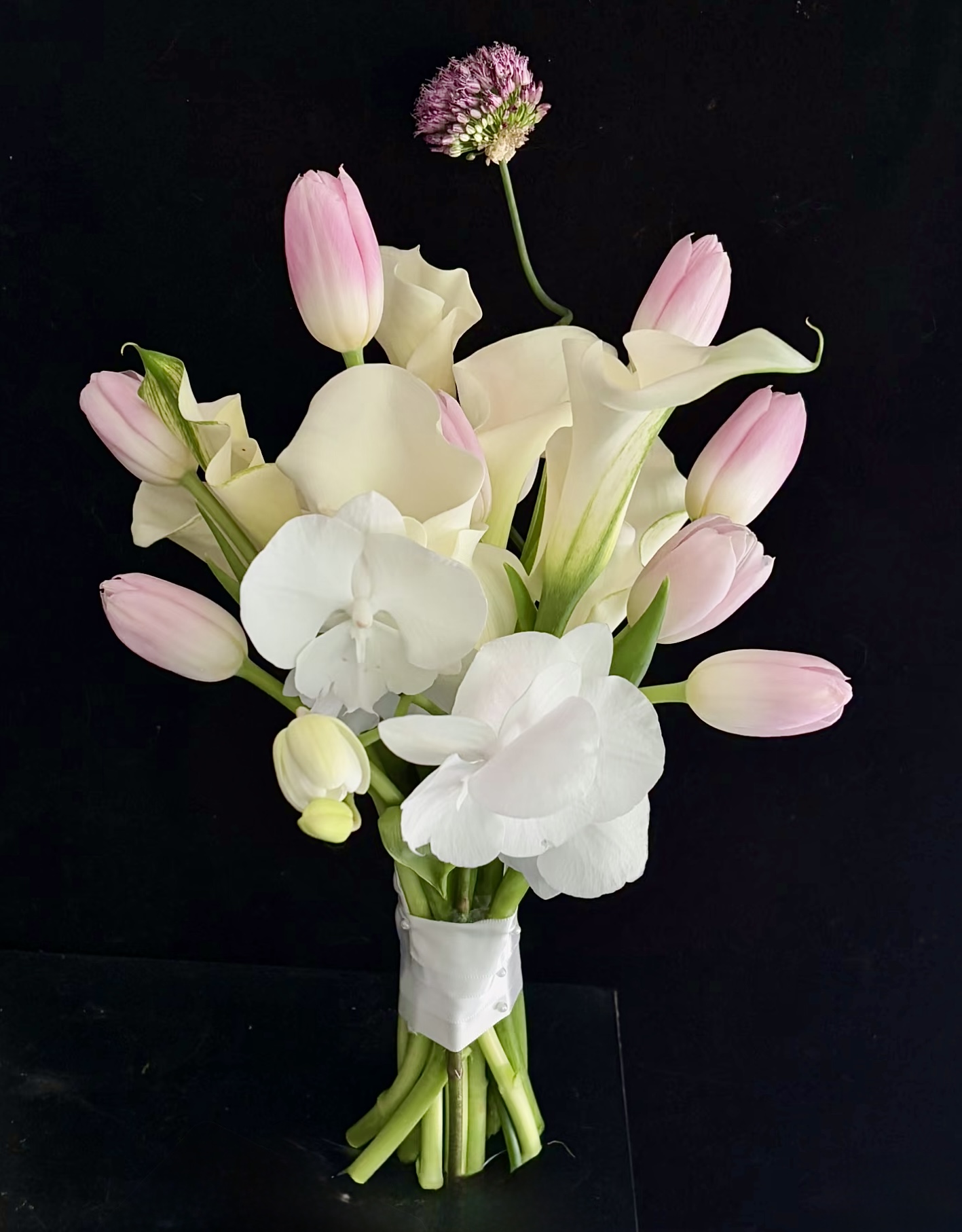Sản phẩm là hoa nhập khẩu bao gồm: 8 hoa tulip, 6 calla lily, lan hồ điệp, alium.