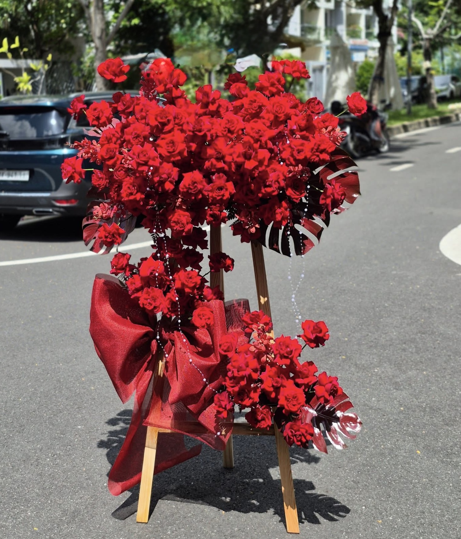 Mỗi kệ hoa tone đỏ không chỉ đẹp về hình thức mà còn mang ý nghĩa phong thủy, giúp người nhận thêm phần tự tin và hạnh phúc trong ngày vui.