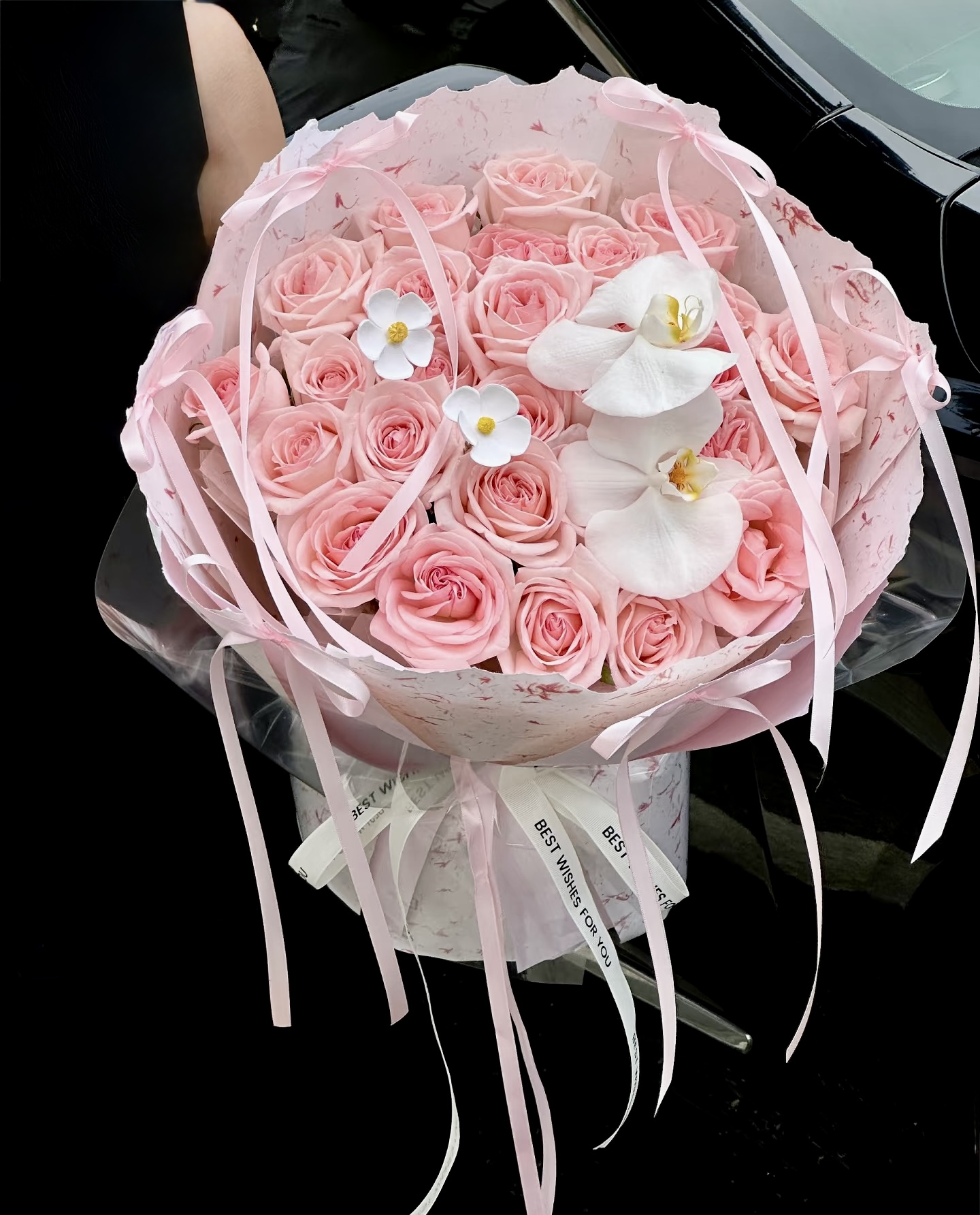 Bó hoa tươi tone hồng thắm với những cánh hoa mềm mại, e ấp tựa như những lời thì thầm yêu thương. Mỗi bông hoa mang một vẻ đẹp thanh thoát, tươi mới, như một làn sóng nhẹ nhàng, mang đến sự yêu thương tinh khiết và ngưỡng mộ chân thành. Với mỗi cánh hoa mềm mại, bó hoa trở thành thông điệp yêu thương nhẹ nhàng, ấm áp, như một cái ôm thật nhẹ vào trái tim người nhận.