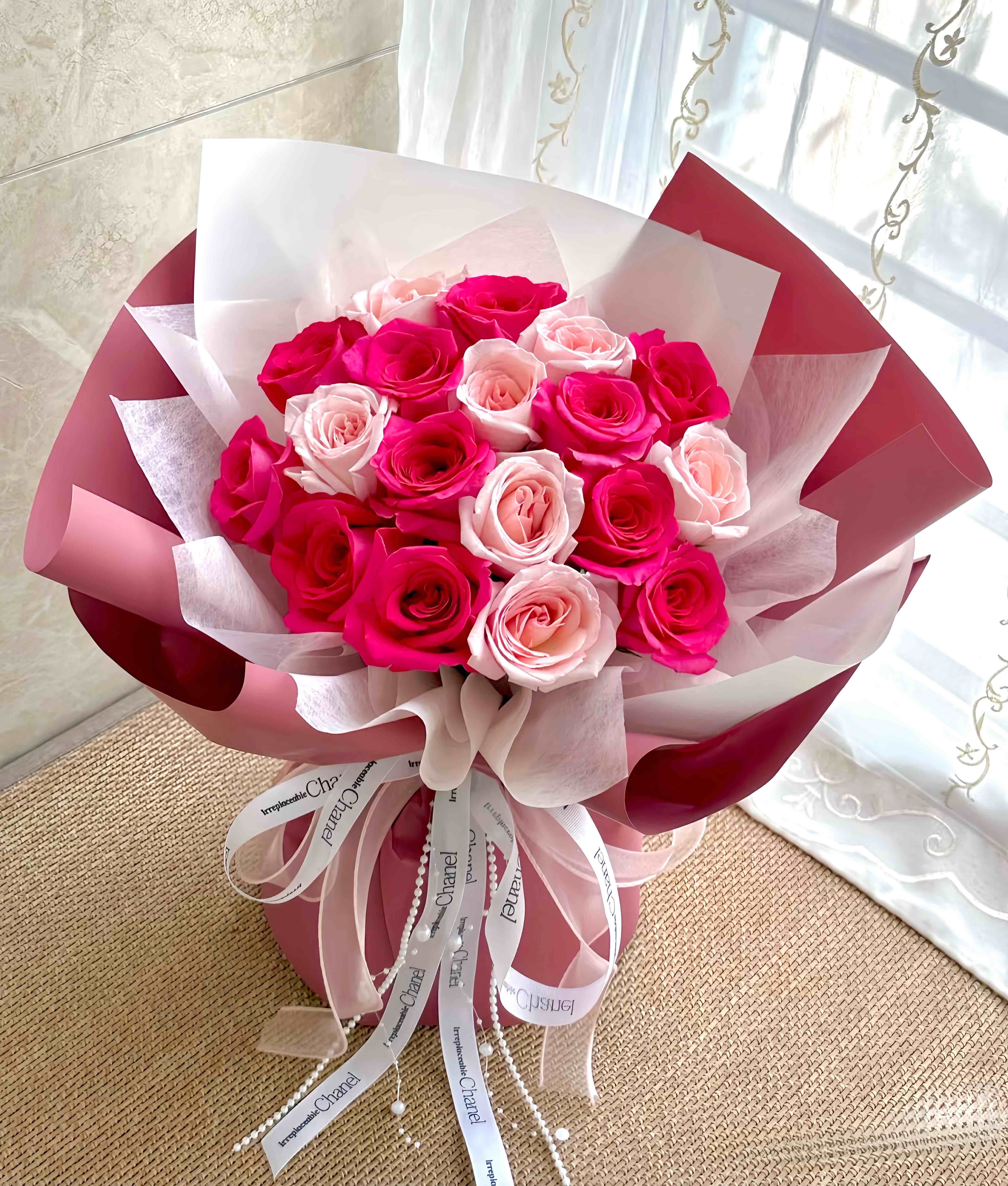 Hoa gồm có: 18 hoa hồng pinkploy mix hồng, lá phụ...