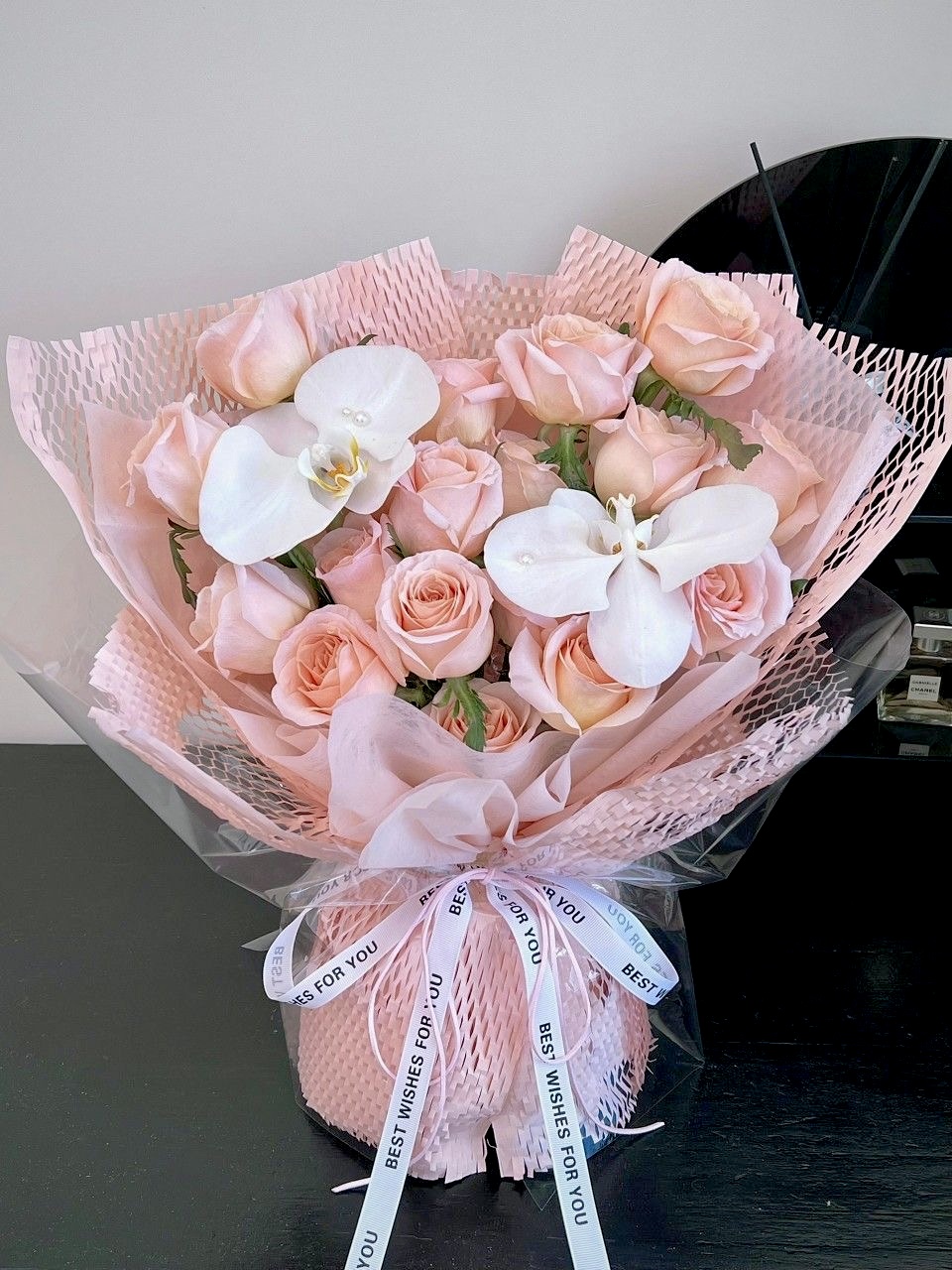 Hoa gồm có: hoa hồng shimmer, lan hồ điệp, ...