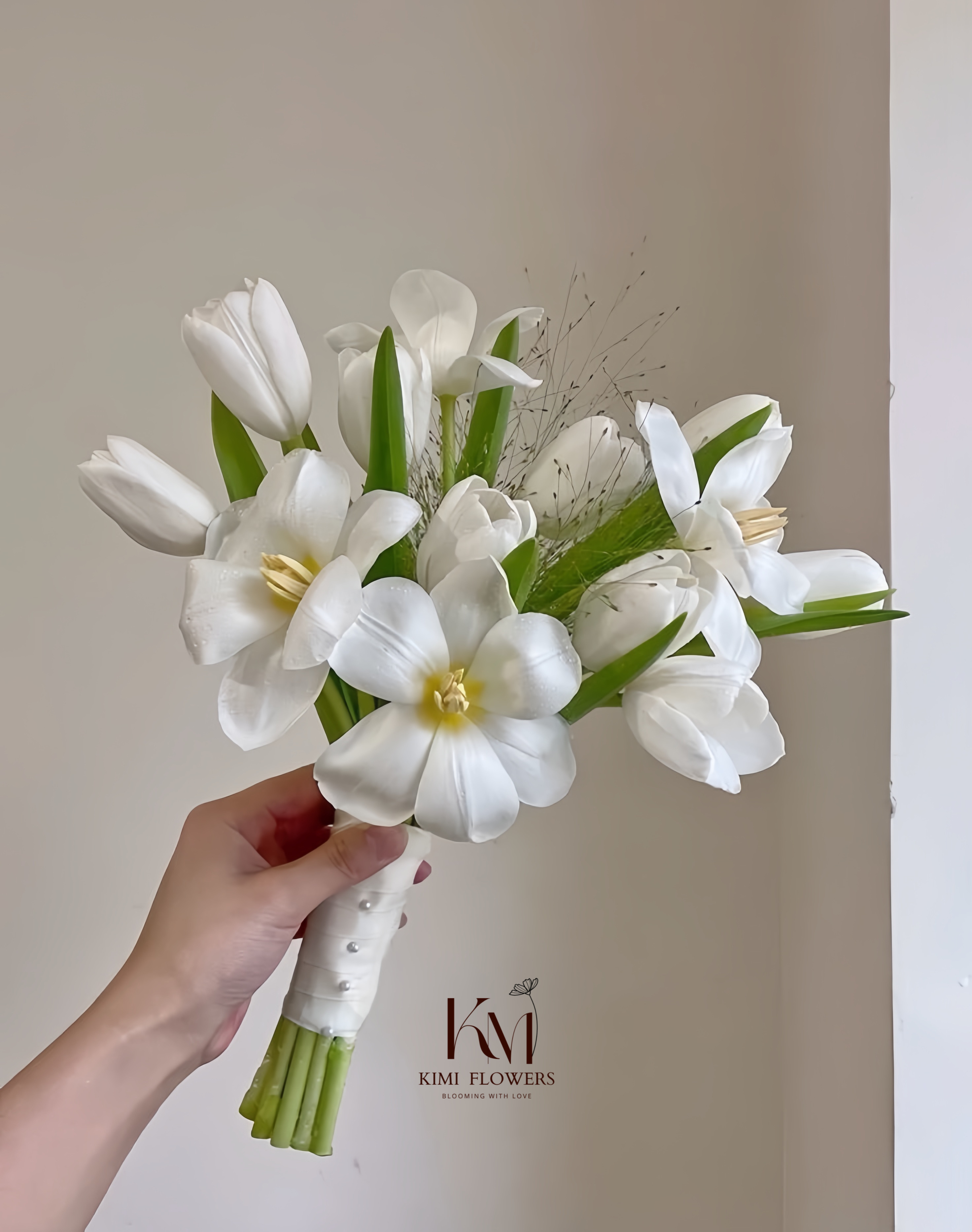 Tại KIMI Flowers, chúng tôi thiết kế bó hoa cưới tulip theo tone màu bạn mong muốn: tulip trắng thanh khiết, hồng dịu dàng, vàng rực rỡ hay tím mộng mơ. Hoa được phối cùng lá bạc, baby hoặc các loại hoa nhập để tăng độ mềm mại và nổi bật cho tổng thể.