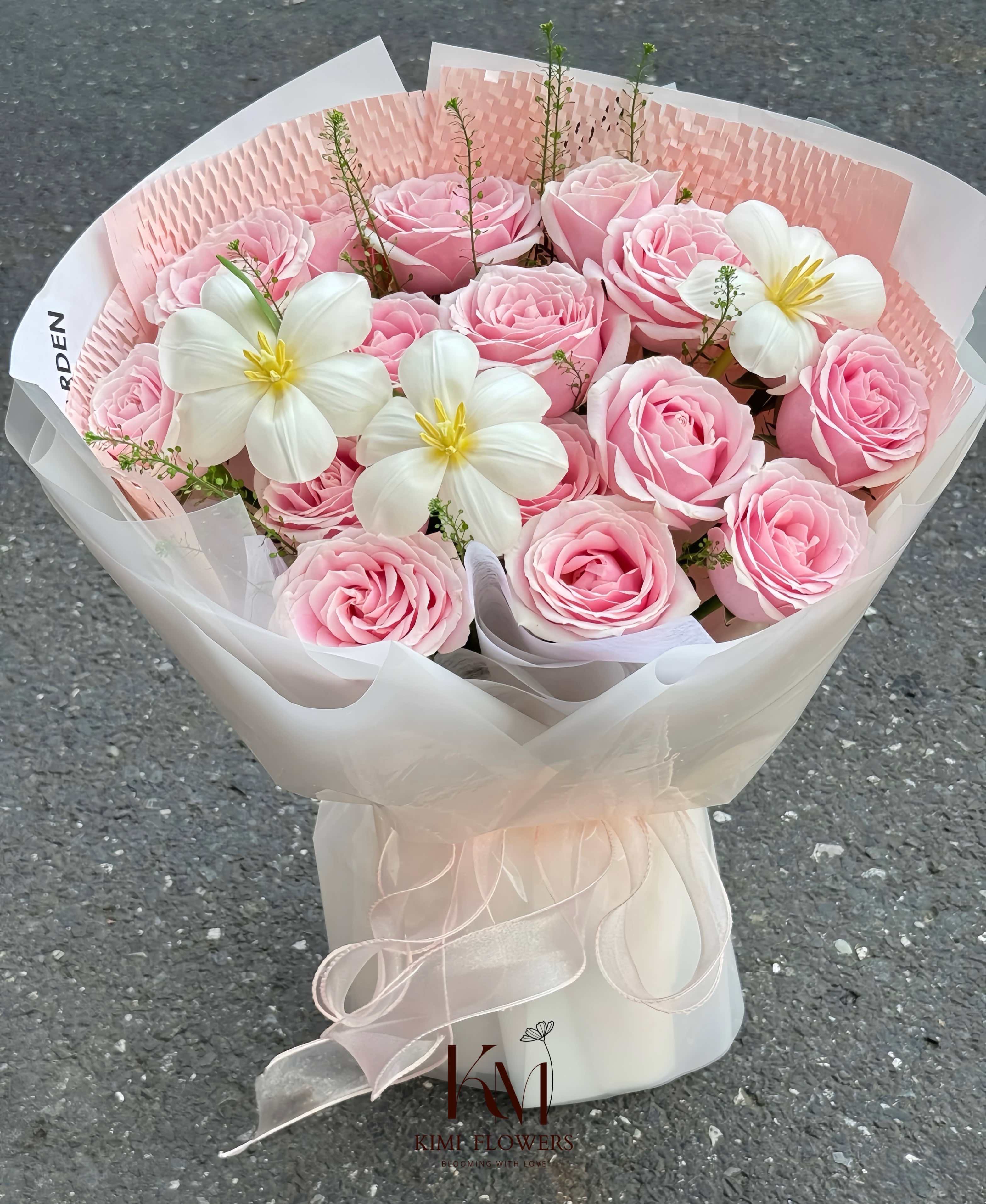 Hoa gồm có: 15 hoa hồng mix cùng hoa tulup trên nền giấy hồng baby xinh yêu.