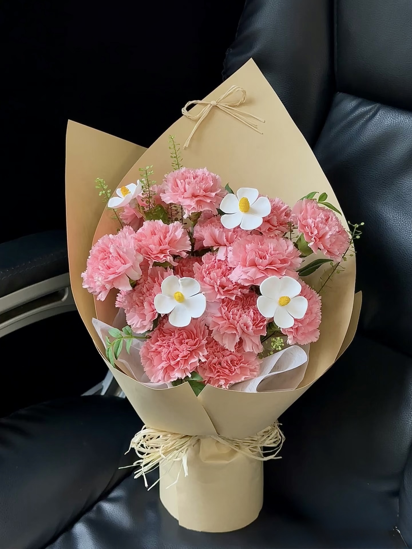 Hoa bao gồm: hoa cẩm chướng (phăng) hồng mix hoa cúc gỗ.
