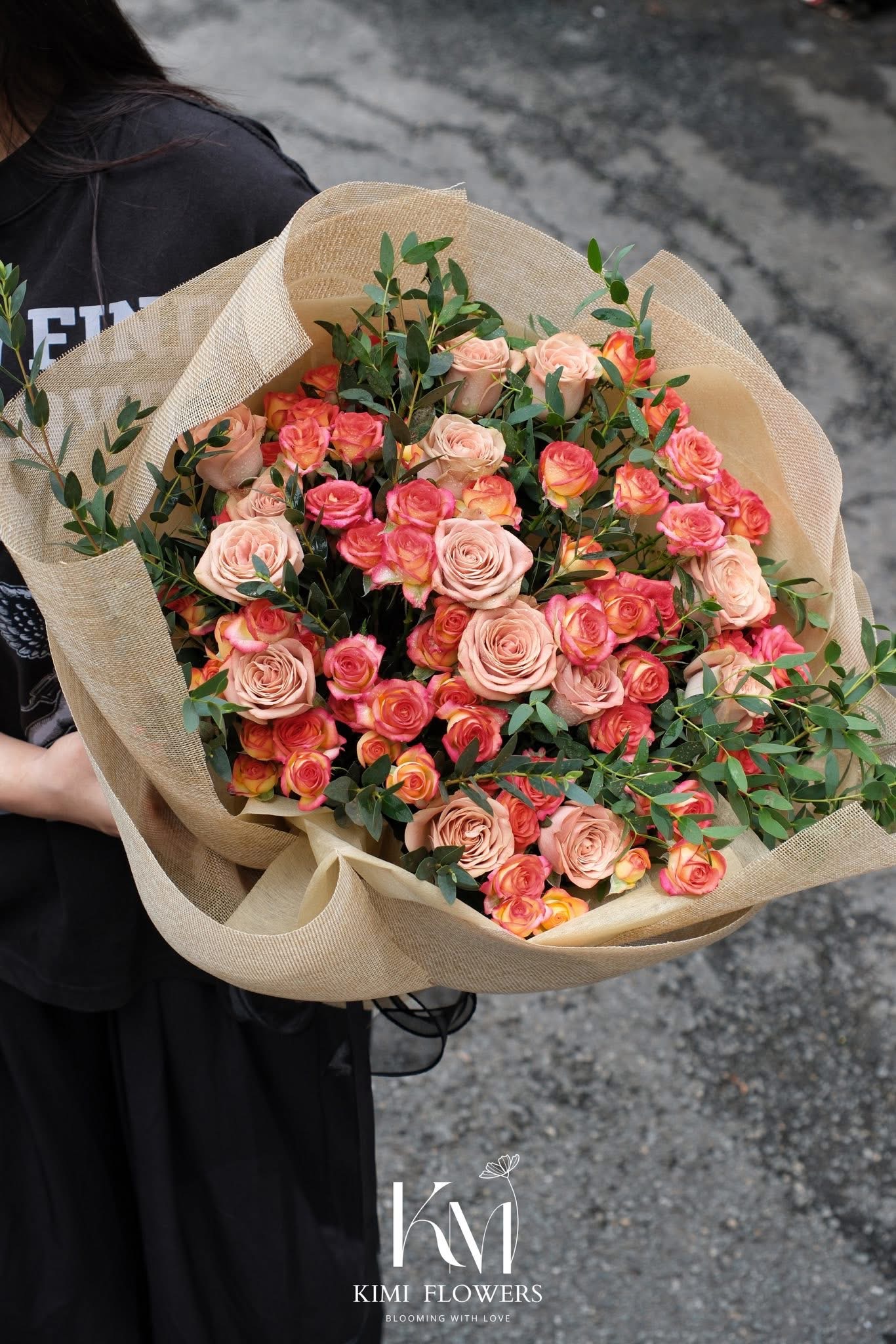 Hoa gồm có: 13-15 hoa hồng capuchino mix cùng hoa hồng chùm. rực rỡ nhưng không quá chói chang.