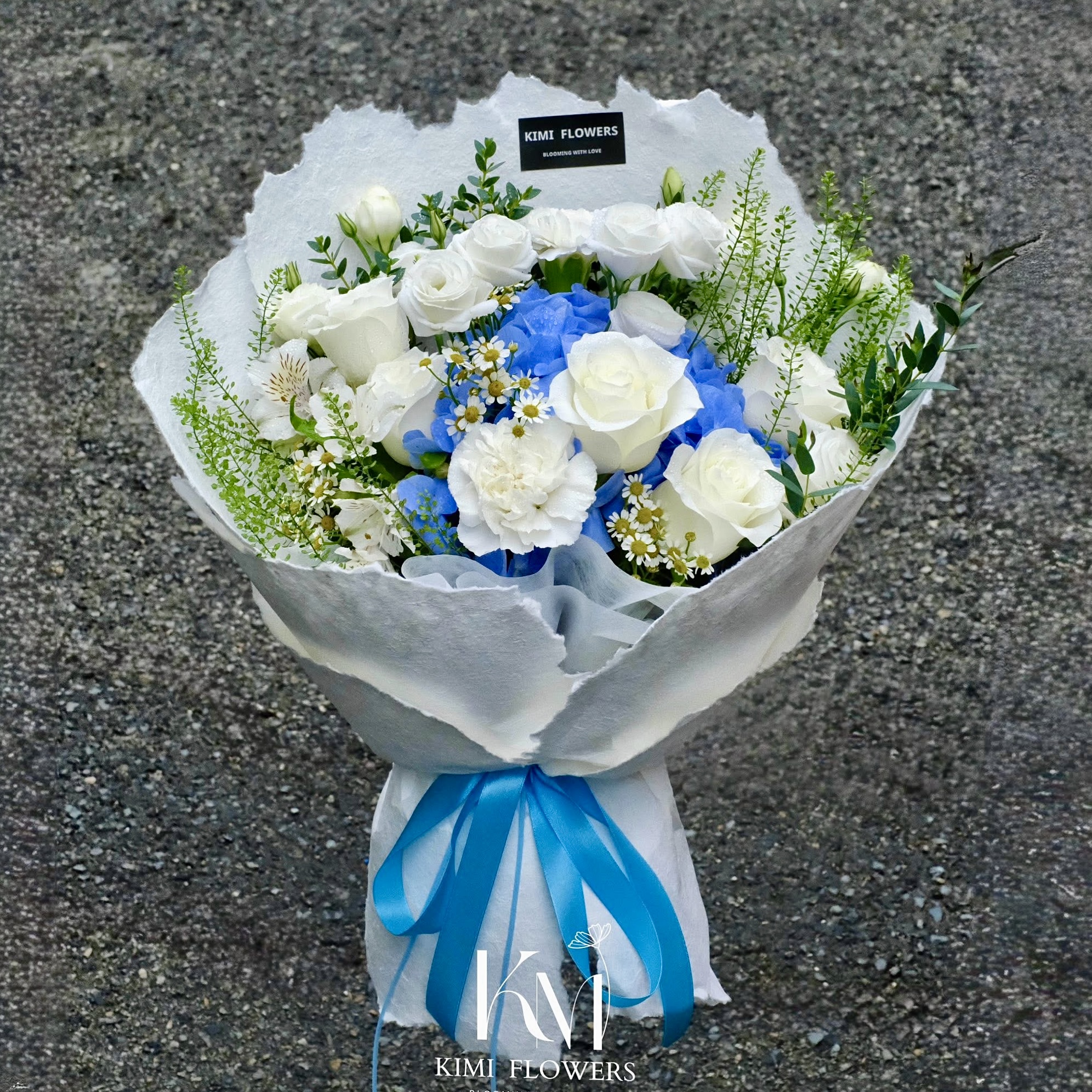 Hoa gồm có: hoa hồng trắng, cát tường trắng phối cùng cẩm tú cầu xanh, cúc tana kèm lá phụ.