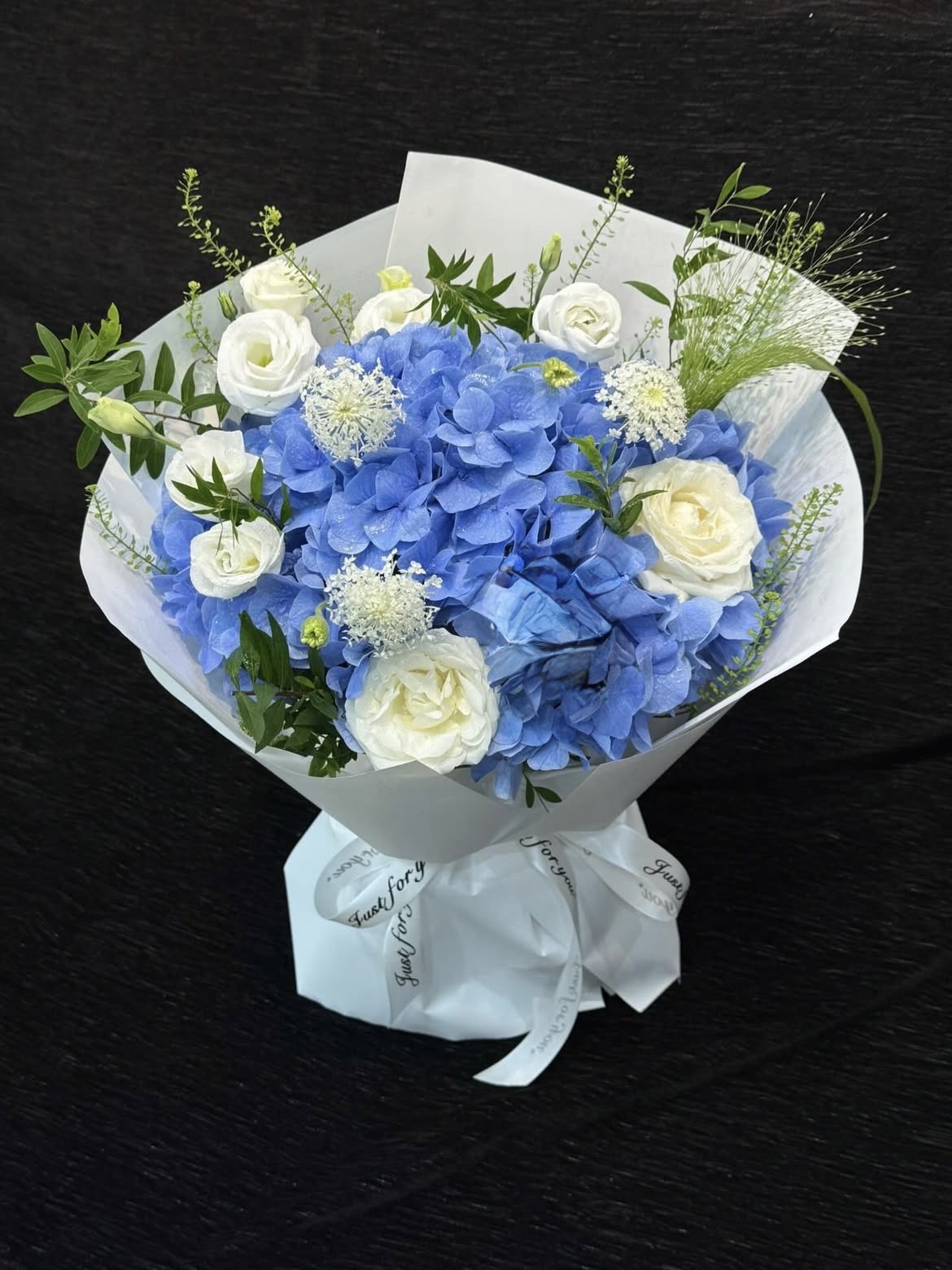 Bó hoa chủ đạo là hoa cẩm tú cầu xanh dương – biểu tượng của tình yêu ngọt ngào, sâu sắc và bền vững, gửi gắm lời chúc may mắn, hạnh phúc và thịnh vượng. Với vẻ đẹp thanh thoát, tinh tế, lan tường còn đại diện cho sự lãng mạn, dịu dàng, thay lời muốn nói để bày tỏ tình cảm trân trọng, yêu thương đến người bạn quý mến.