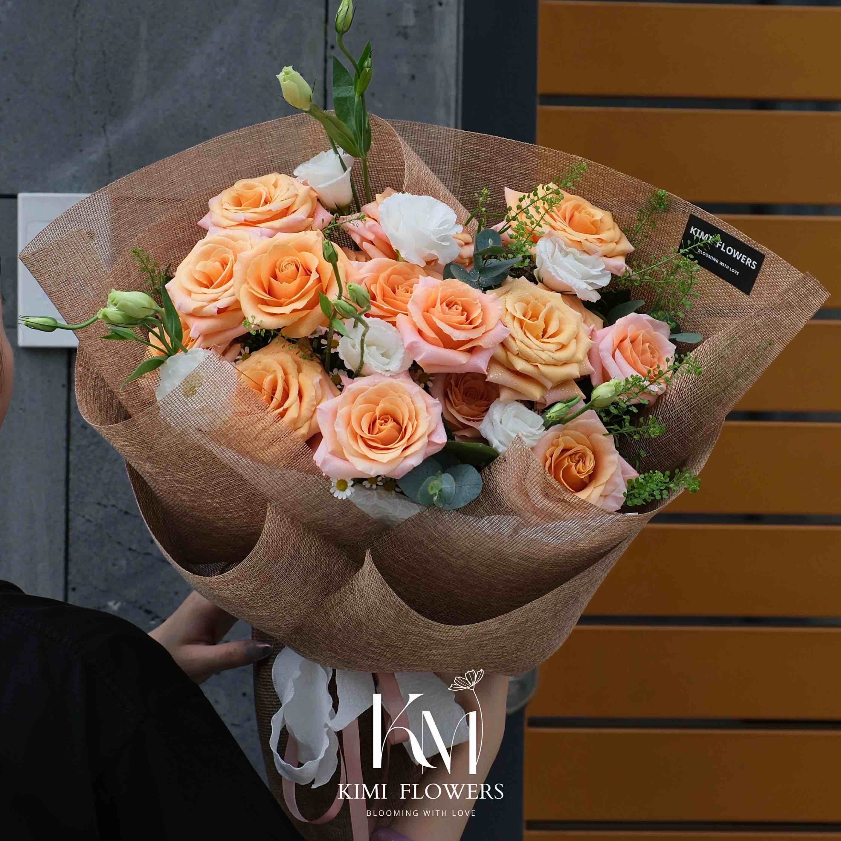 Hoa gồm có: 15 hoa hồng shimmer mix cùng hoa lan tường trắng