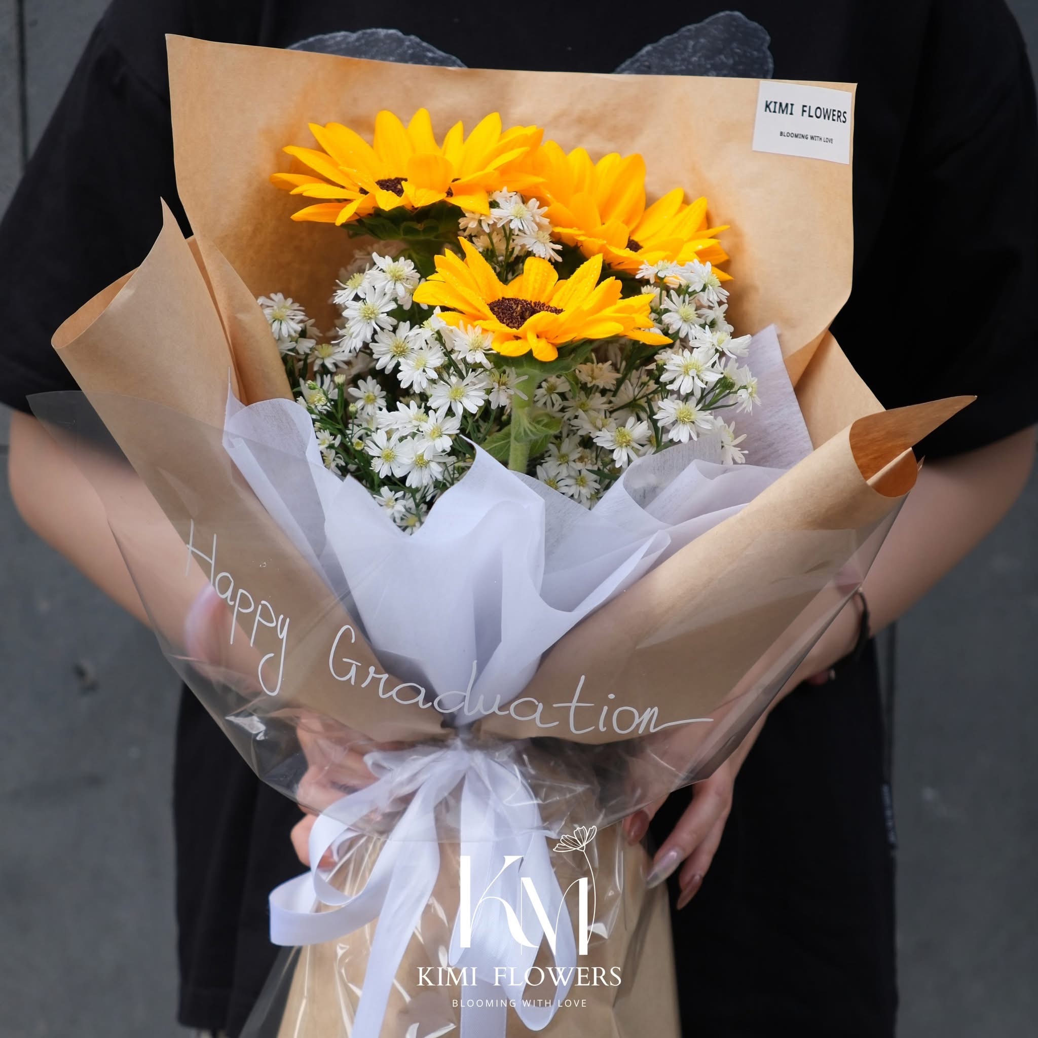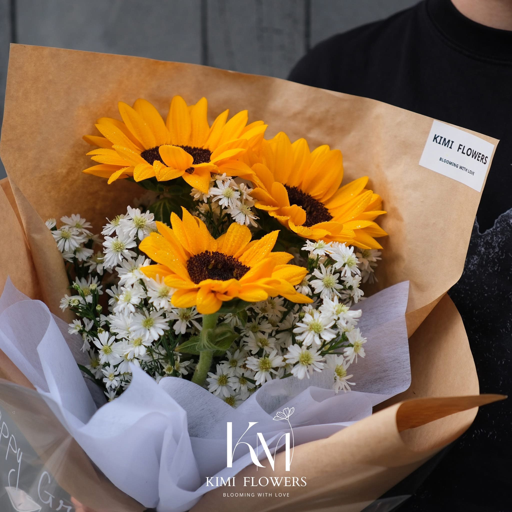Bó hoa hướng dương như mặt trời nhỏ, mang đến niềm vui, năng lượng tích cực và hy vọng cho người nhận. Từng bông hoa vươn mình rực rỡ như lời nhắn “hãy luôn lạc quan, mạnh mẽ và tỏa sáng”. Món quà này không chỉ ngọt ngào, lãng mạn mà còn gửi gắm thông điệp yêu thương, cổ vũ tinh thần.