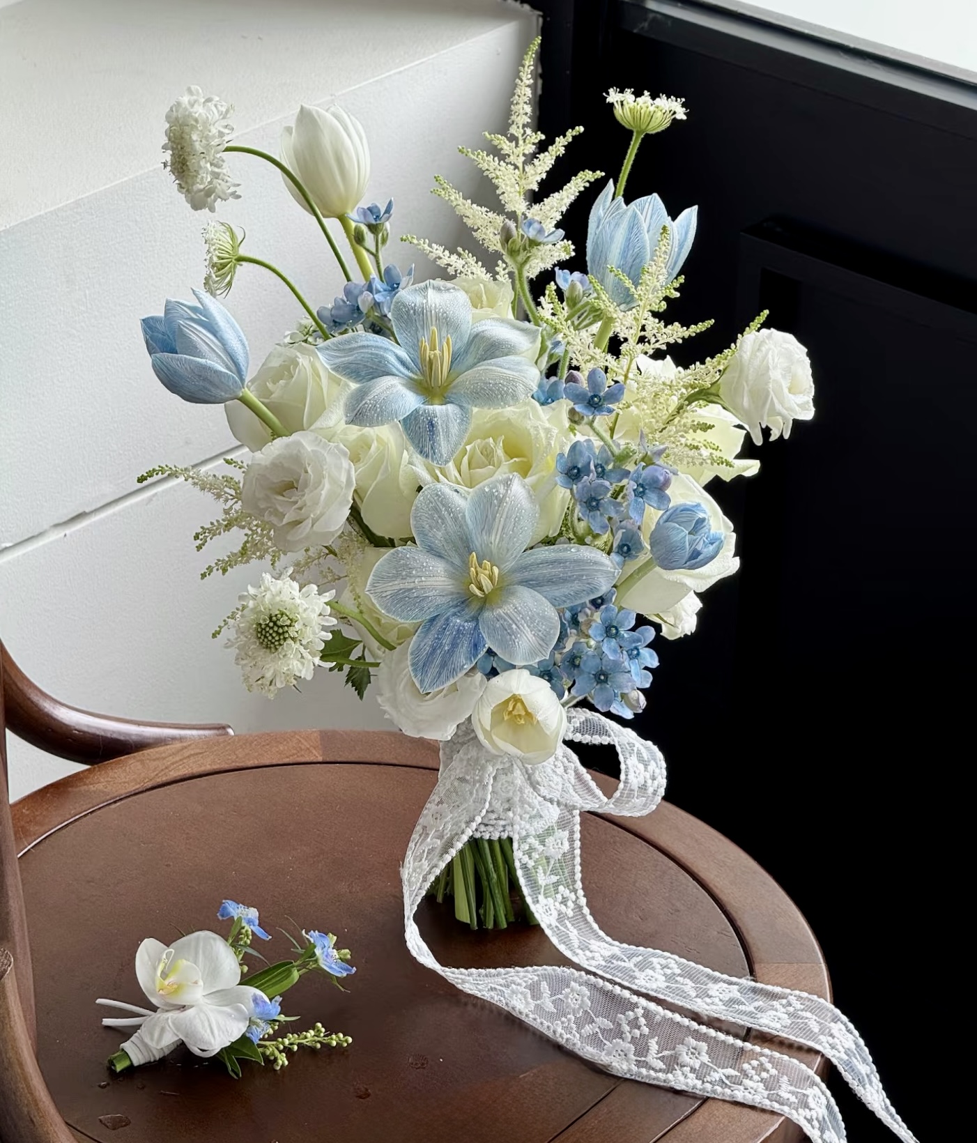 Sản phẩm bao gồm: 6 hoa tulip nhập khẩu có nhuộm xanh dương, hoa lam tinh (sao xanh), hoa hồng trắng..